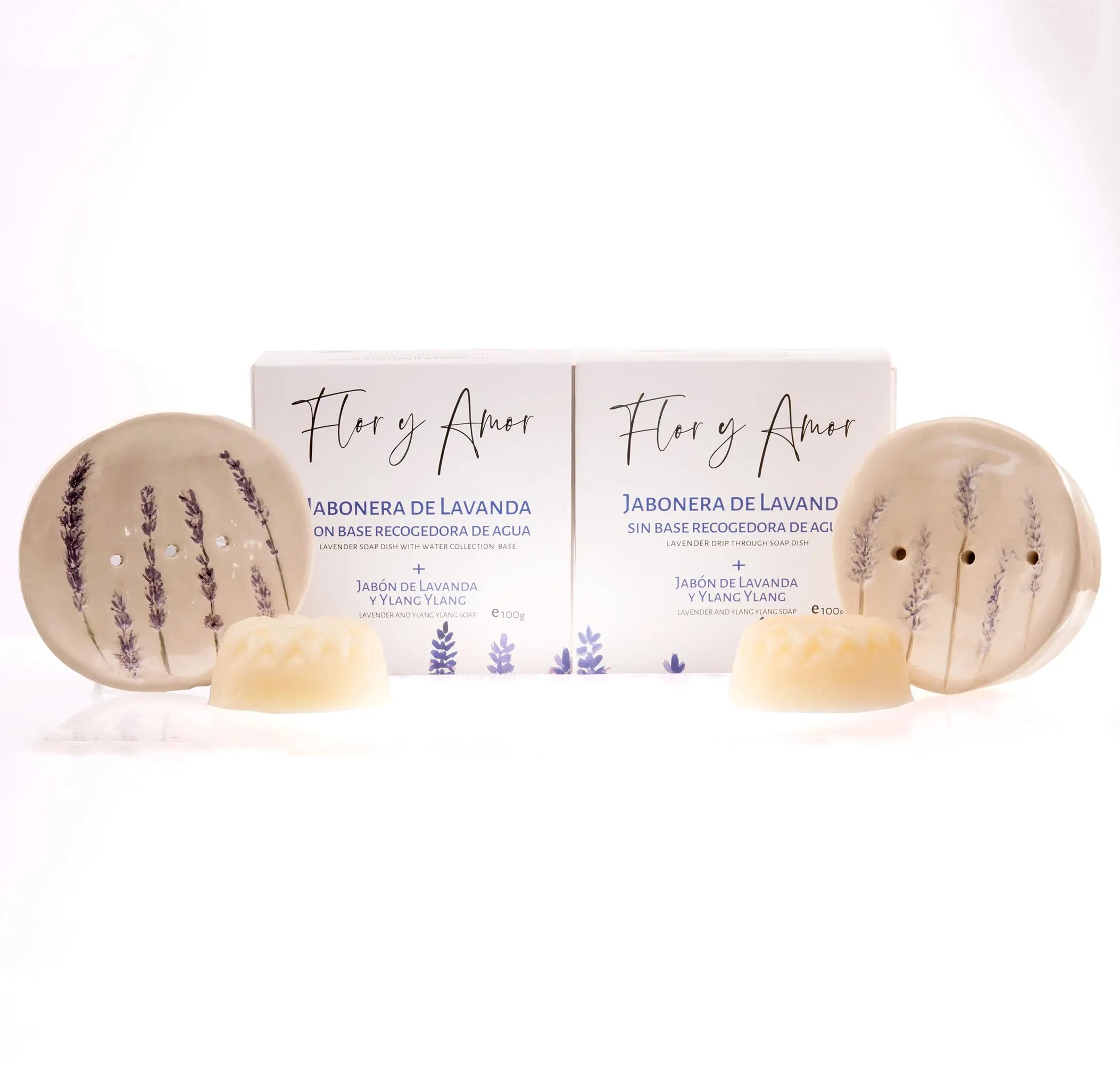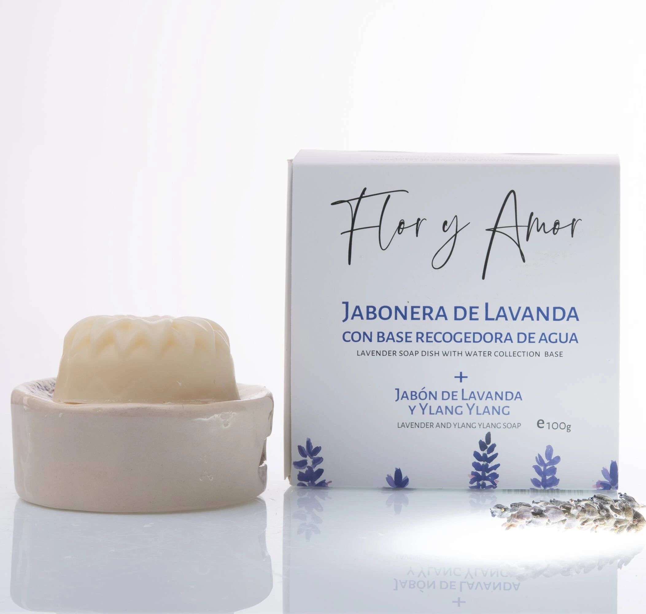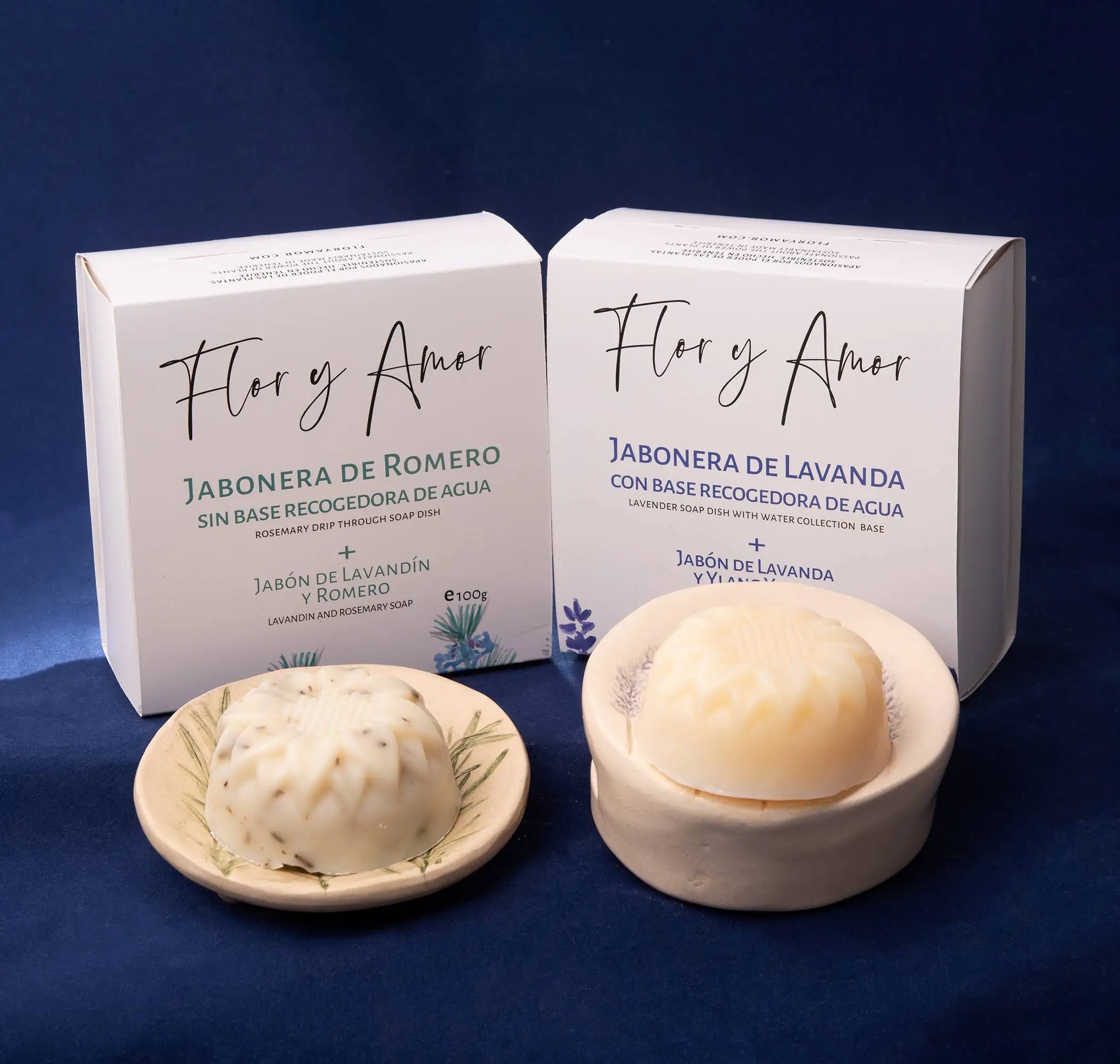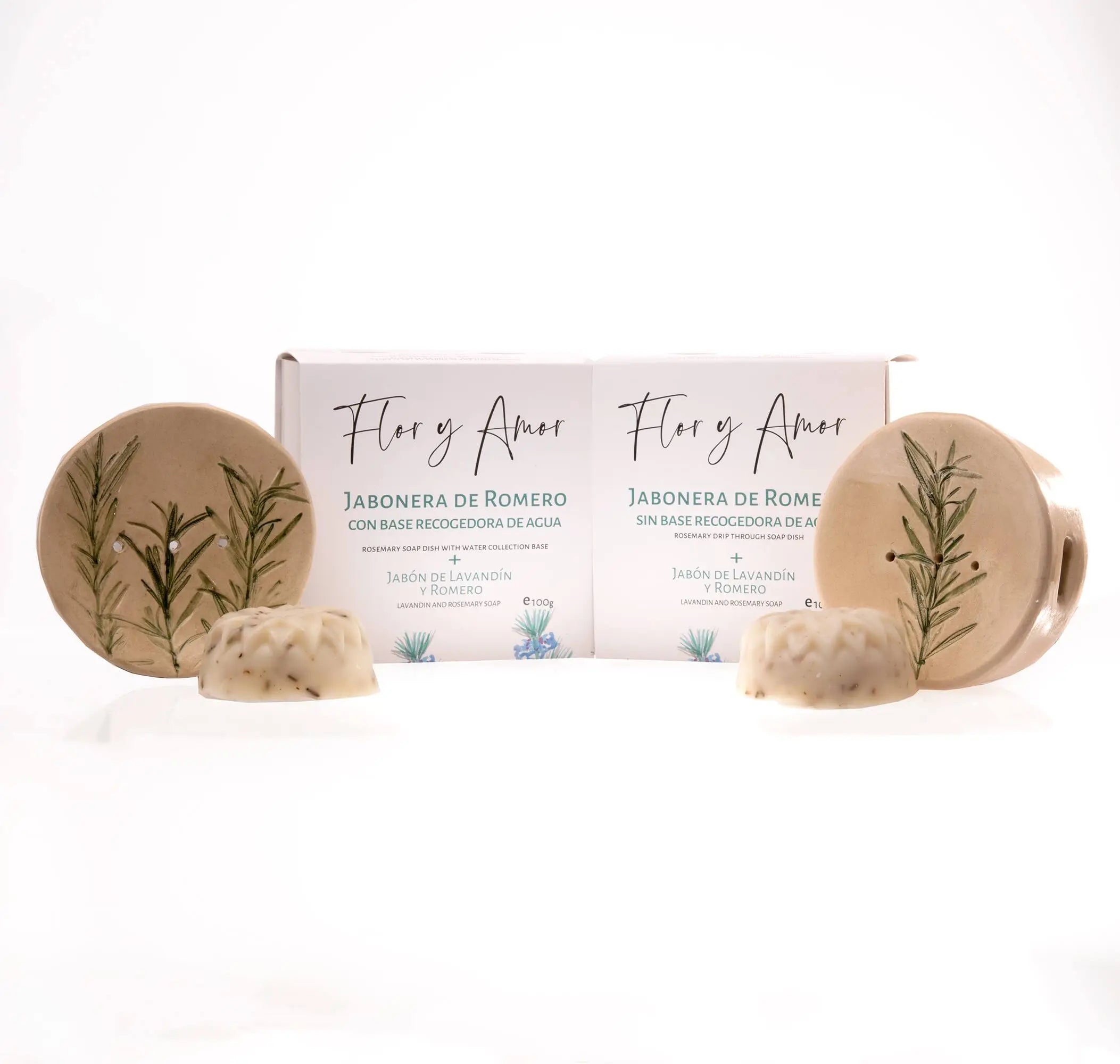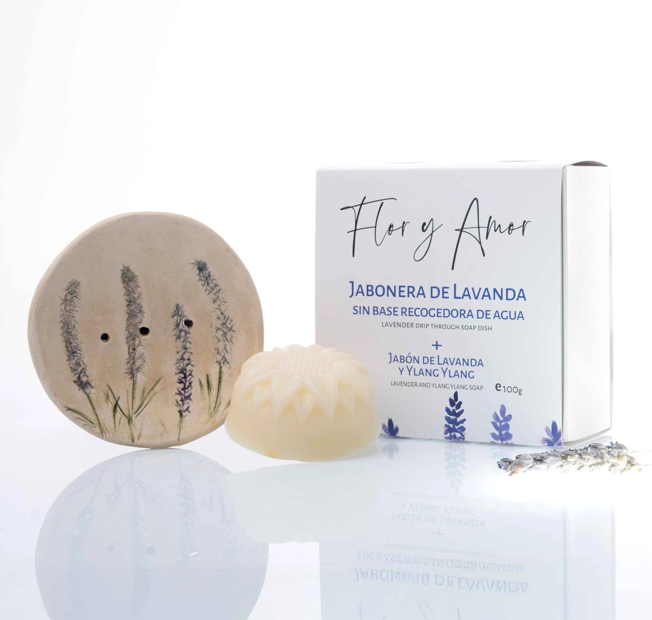 Our handcrafted ceramic soap dish with a delicate hand-painted lavender or rosemary imprint, made by skilled Canary Island artisans and designed for our sunflower-shaped soaps. Available with a water collection base or drip-through drainage. Each includes a matching 100g natural soap.